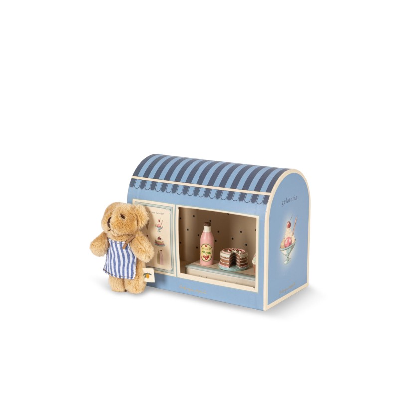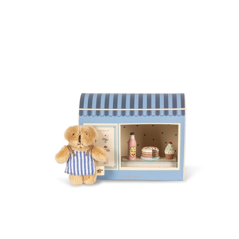 Sweets for my sweet. This cute little boutique is designed for our miniature teddy universe and includes everything you need to run a little sweet shop, including two small cakes, a bottle, and a tiny teddy with an apron.