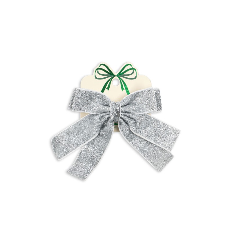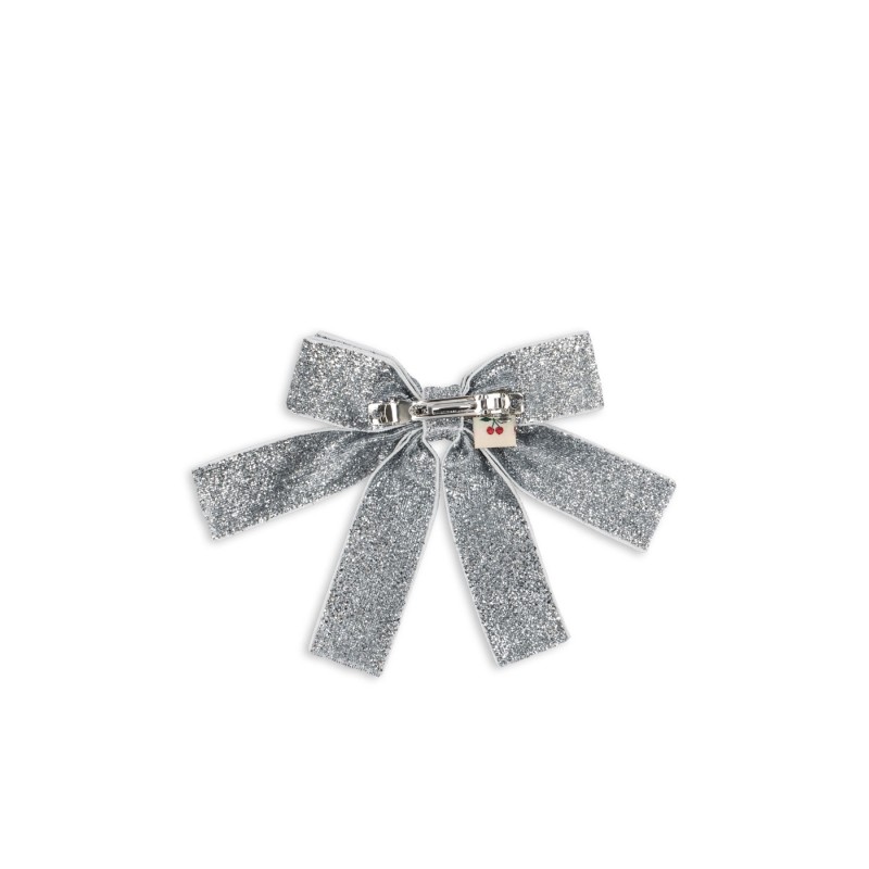 Glitter bow barrette with an easy clip-on feature that makes it easy to wear.