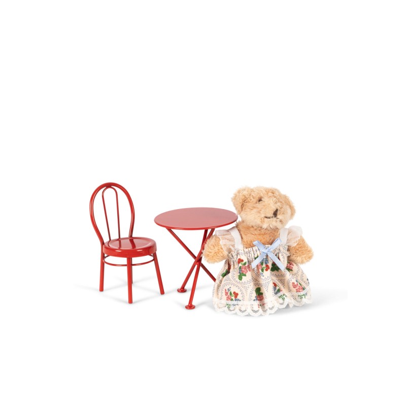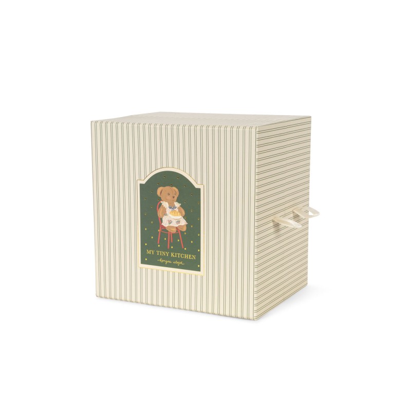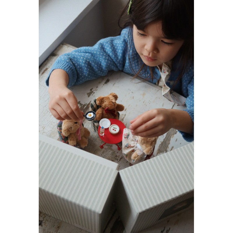 So tiny and so cute. This little tiny house is made for your favorite new tiny teddies. Complete with a kitchen and dining room, the tiny house comes with a little chair and table, a little pastry and beverages that are prepared in the kitchen. Includes a tiny teddy to play with.