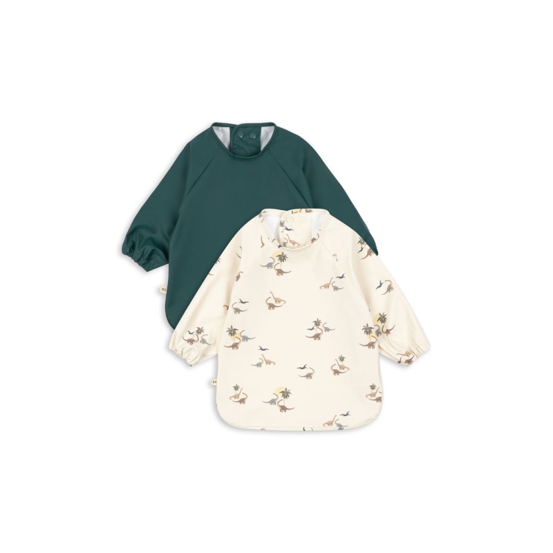 Long sleeved bib designed with elasticated sleeves and snap buttons at the back neckline.