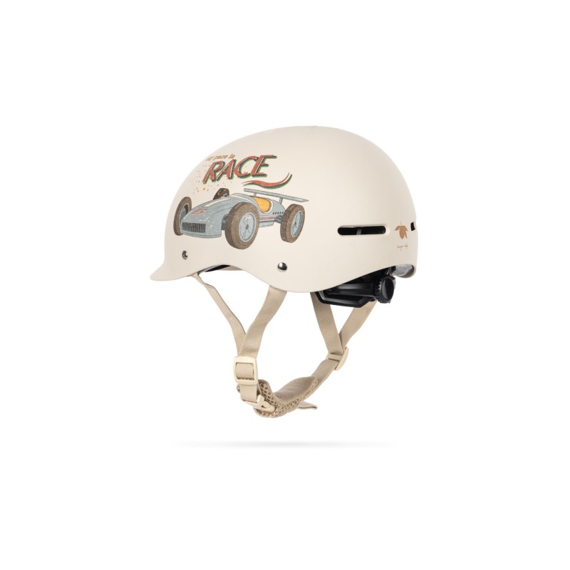 Safety first - but always in style with the Konges Sløjd bicycle helmet. Our helmet features practical size adjustment with easy grip, a vizor for sun protection, and extra visibility with reflexes. Designed with removable padding inside, ventilation holes, and an classic buckle to keep it in place.