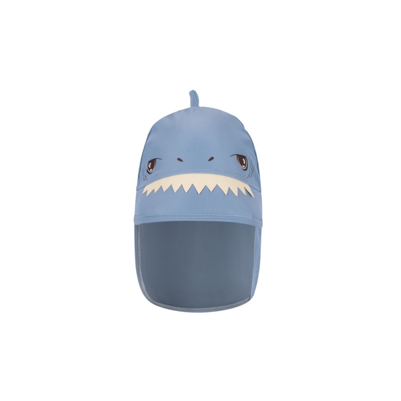 Sun hat with extra long fabric in the back that keeps little necks protected from the sun. Designed with a fun shark fin and teeth at the top.
