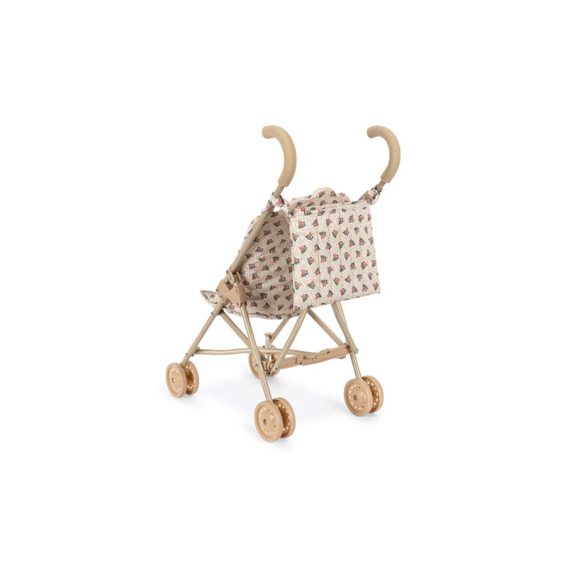 Doll stroller designed with a harness, carriage bag, and double wheels on all four legs for extra stability. Features removable fabric. Comes fully assembled and is easy to fold and store.