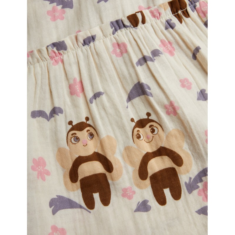 Woven dress with an all over bee print, made from 100% GOTS certified organic cotton muslin. Designed with short puff sleeves, a gathered waist and a flowy skirt for a light and airy feel. The dress features a button closure at the back for easy dressing.