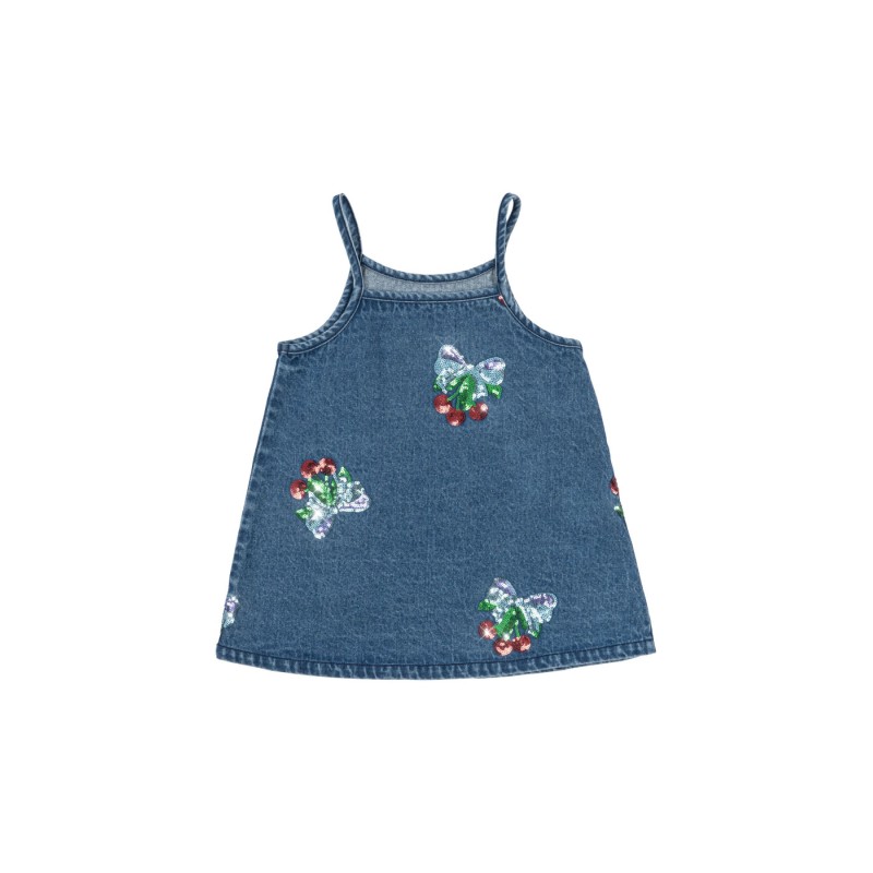 Denim strap dress with embroidered sequin cherry bows.