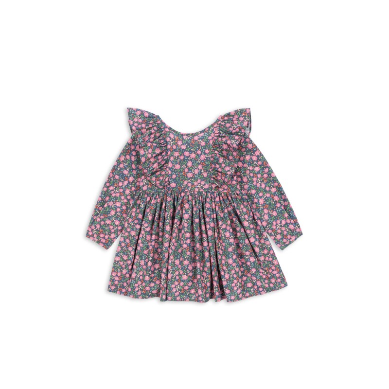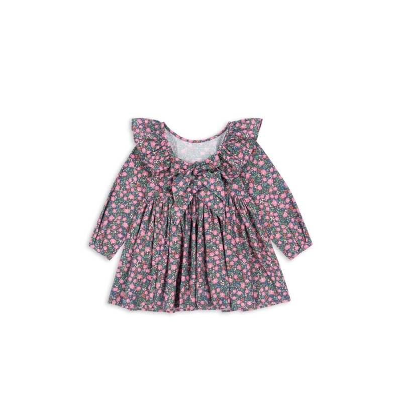 Soft organic cotton dress with frill details at the sleeves and bow details in the back.