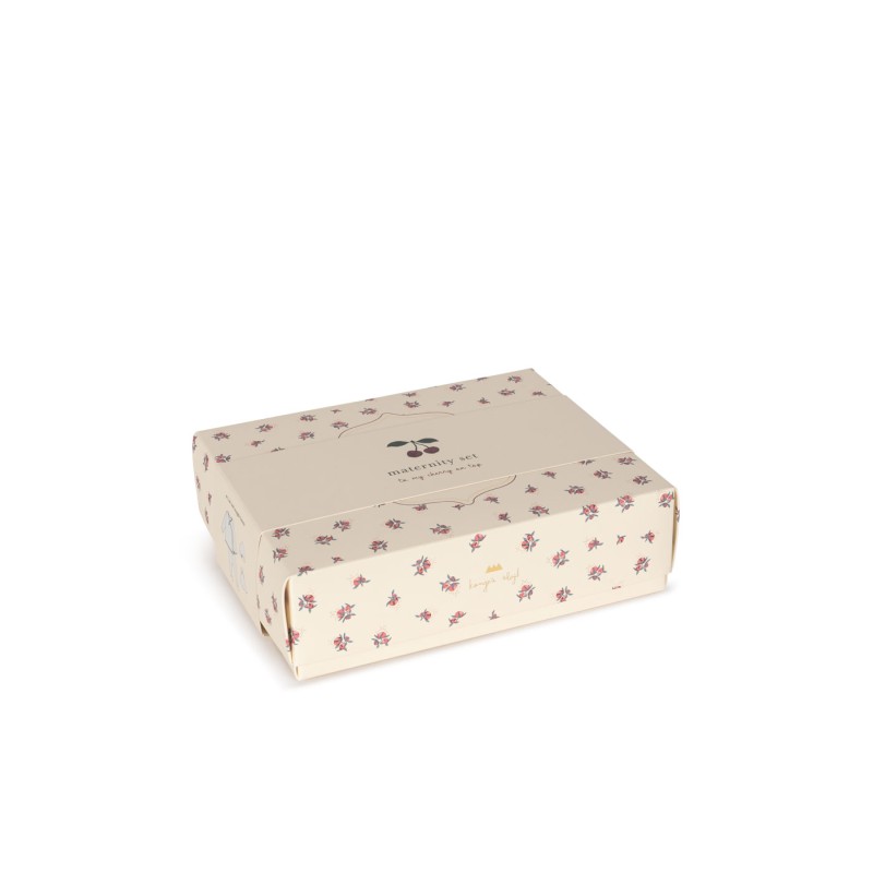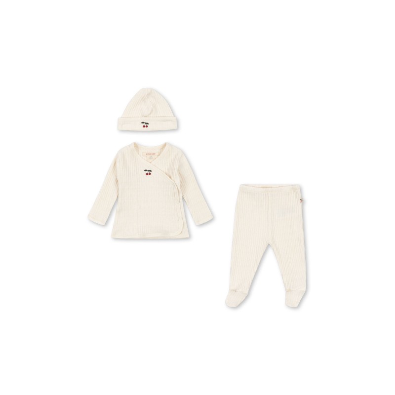 The perfect gift for new parents: A thoughtful maternity package with a soft wrap cardigan, footed pants, a baby hat, and a soft snuggle bunny.