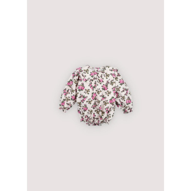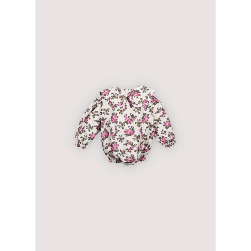 Soft and cozy baby romper crafted in premium flannel cotton, featuring long sleeves and a delicate floral print. Designed with a charming matching fabric collar, it opens at the back and bottom with tone-on-tone snaps for easy dressing and changing.