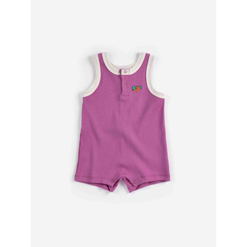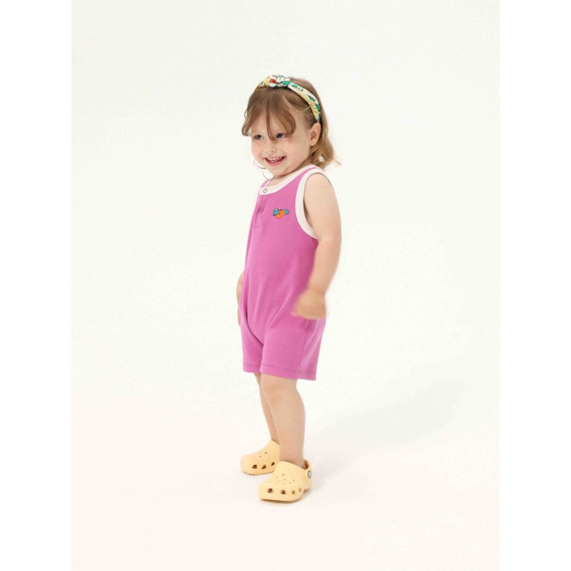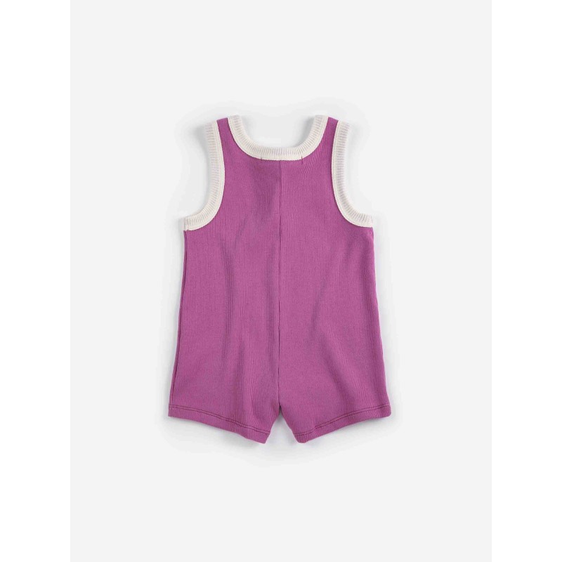 Fuchsia playsuit. Designed with sleeveless, front snap fastening, crotch snap fastening, embroidery, loose fit, over knee length and round neck. Made in Spain.