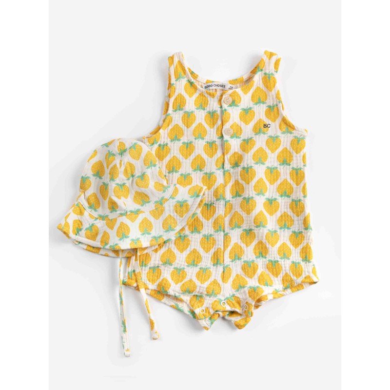 Yellow pack. Designed with sleeveless, front button fastening, crotch snap fastening, embroidery, loose fit, short, structured fabric and wide shoulder straps. Made in Spain.