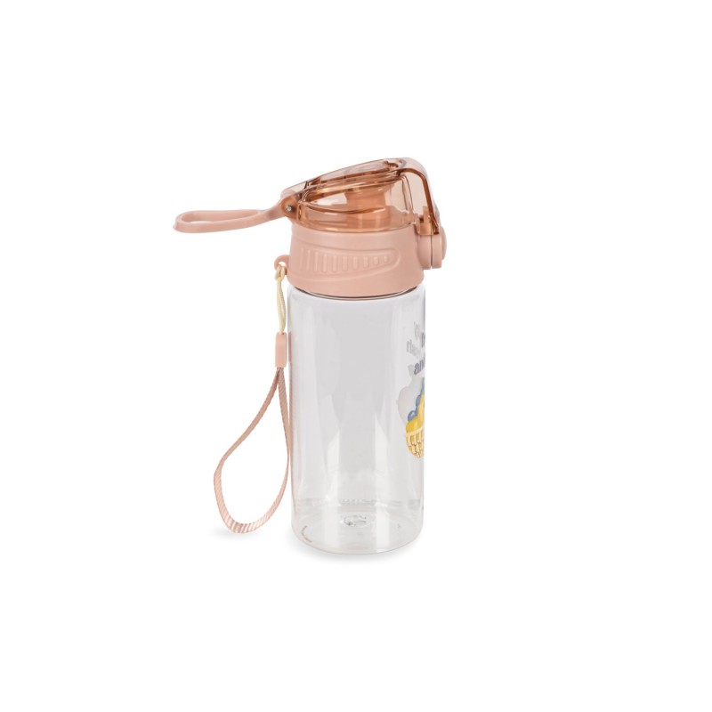 Water bottle with an easy click-up lid. Convenient to bring on the go, it only takes a quick push to pop the bottle open and drink, and the same to snap it shut, keeping it clean and leak-free.