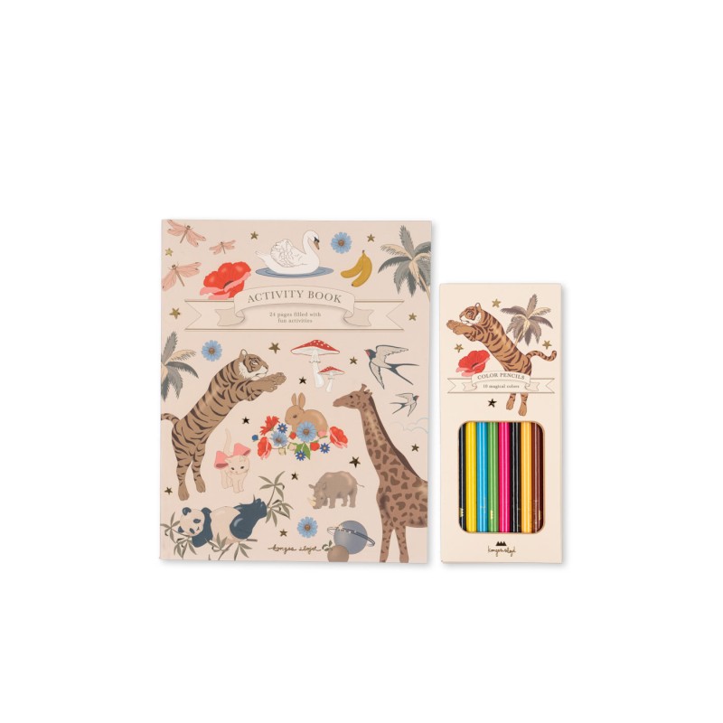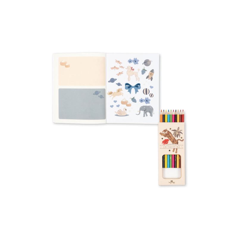 Includes 10 coloring pencils in a decorative box, an activity book with 24 pages, and 3 sheets of stickers.
