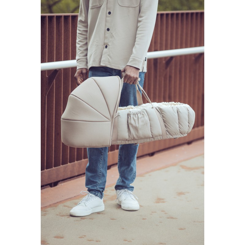 Designed with both functionality and aesthetics in mind, the hood complements the stylish look of the baby nest. The exterior features a solid Dark Olive colour, while the interior is a soft Moonlight Beige. The fabric is made from certified organic cotton.