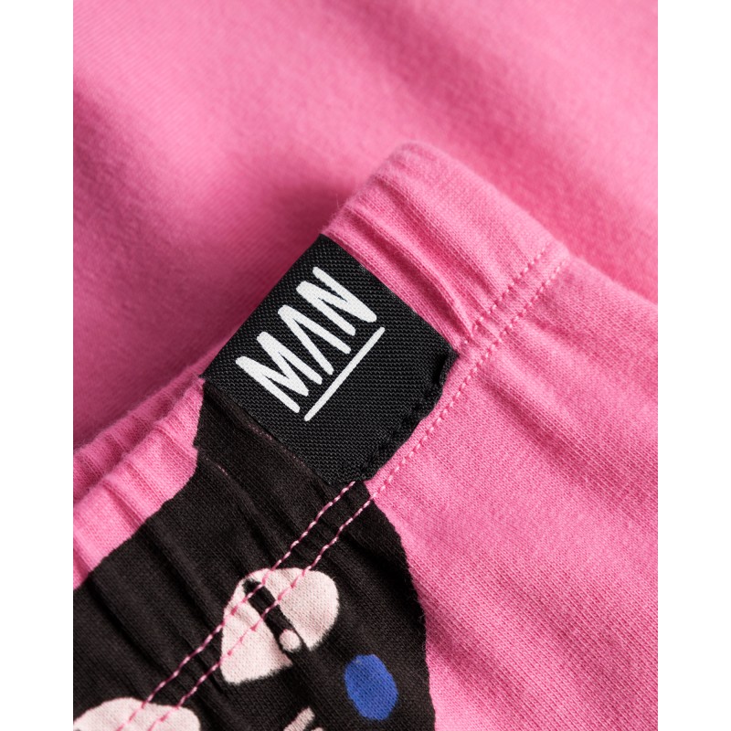 Unisex cat allover leggings with bold black cat illustrations on bright pink. Made from soft organic cotton jersey with stretch and an easy elastic waistband – perfect for running, playing, or just lounging around.