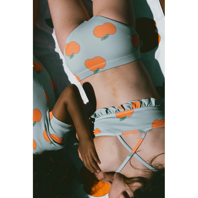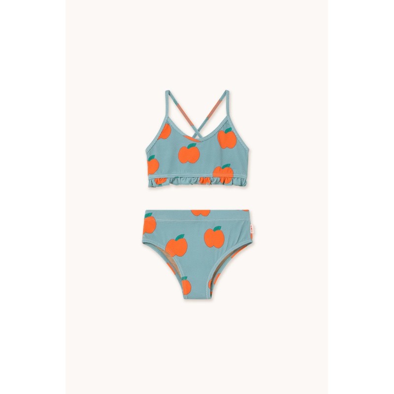 An apple a day just got another meaning. The Apples Swim Set is a cool and colorful option for a day by the water. It comes in two pieces. The top has crossed straps on the back and ruffles at the bottom edge. The bottoms are mid-rise with an elastic waistband.