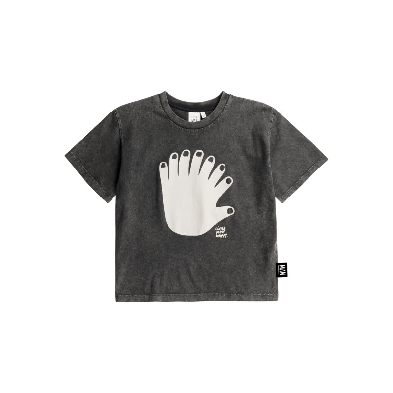 Vintage grey organic t-shirt for kids with a bold handprint. Soft organic cotton, loose fit. Designed in Berlin, made in Portugal.