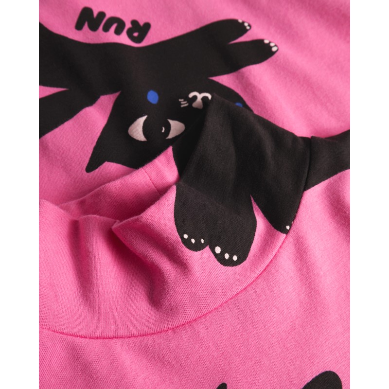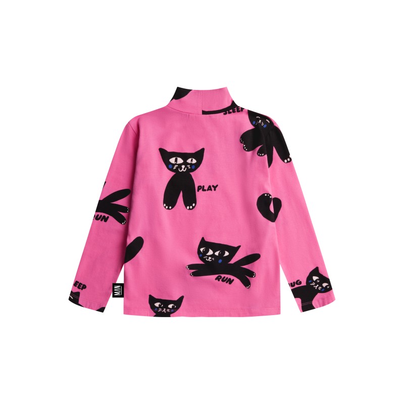 Pink kids turtleneck with playful black cat print – bold, comfy, and full of personality. Made from soft organic cotton jersey with a stretchy fit and a high collar for extra warmth and style.