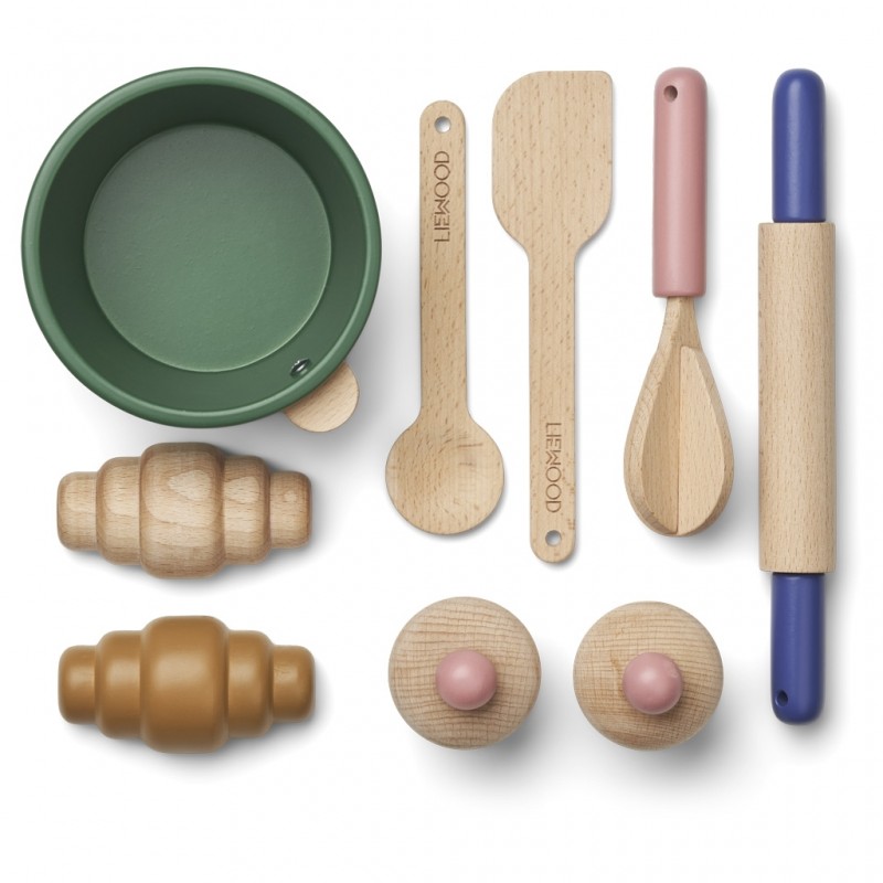 • Set includes: Bowl, whisker, rolling pin, spatula, spoon, two cupcakes and two croissants